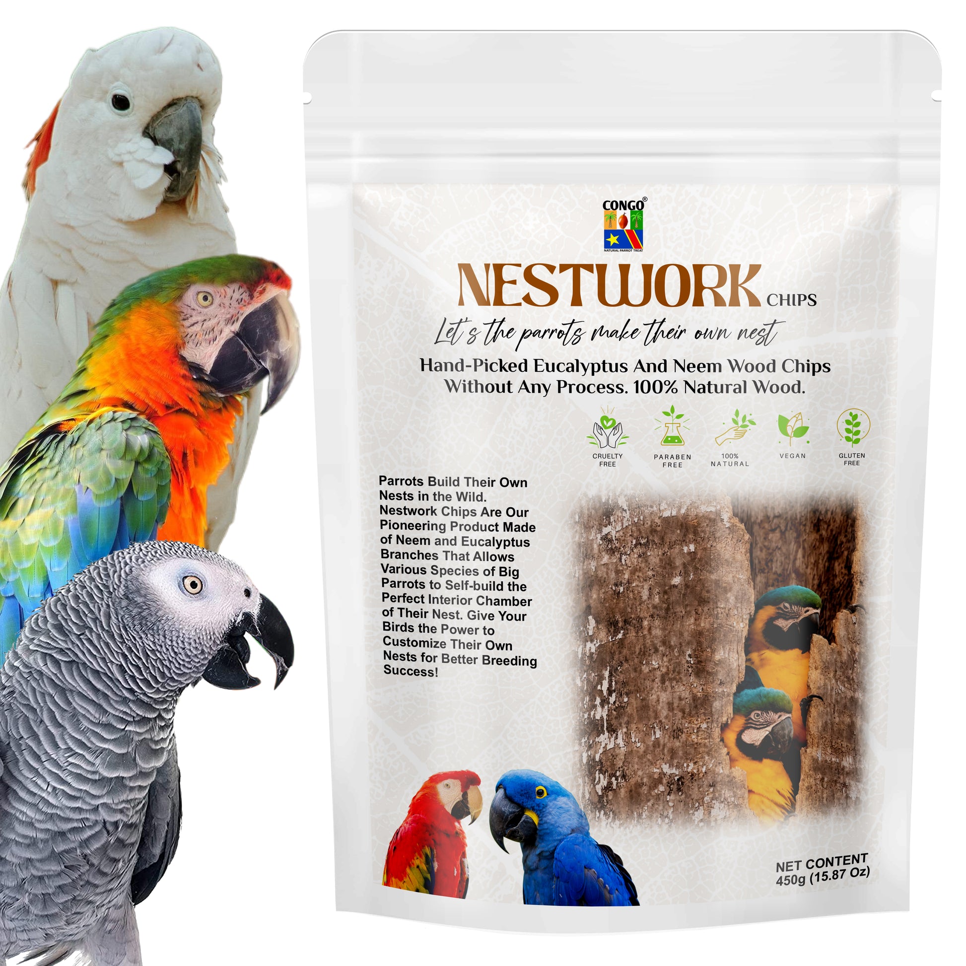 Empower your birds to create their own nests with Congo Nestwork 450g Nesting Material Chips—a natural, safe, and effective way to support your birds' nesting instincts and enhance their breeding success.