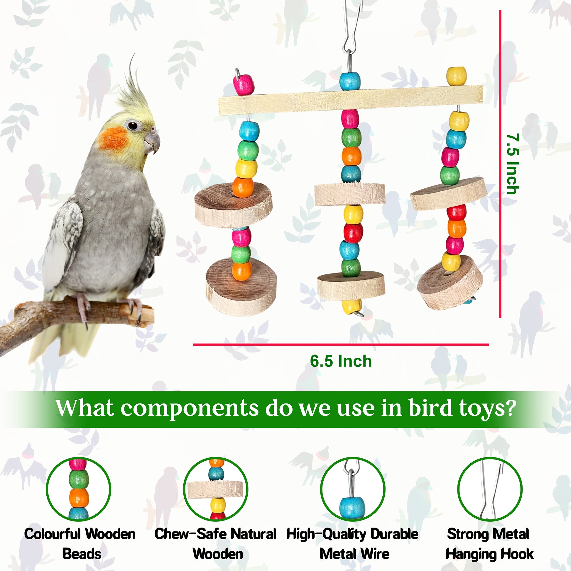 PERFECT SIZE -- Suitable for many Parrot. NATURAL WOODEN SWING--- Made out of blocks that are carved out of solid wood and dyed with food coloring, these hanging bird toys make an excellent selection for birds who have a tendency to chew, bite, forage and hide their treats. YOUR BIRDS LOVE TO SWING-- Stimulates Healthy Exercise and Satisfies a Bird’s Preening Instinct. Parrots love perches that move, so this is the ideal moving perch for your parrot! MULTICOLORED: The rainbow of colors and the frayed texture of the rope featured in the design of these super fun wood bird toys intrigue and engage your parrot in order to encourage instinctive foraging behavior, thus extending and boosting playtime!